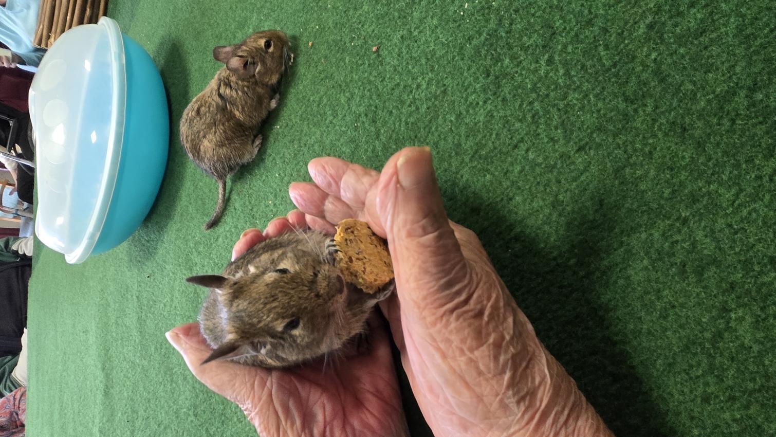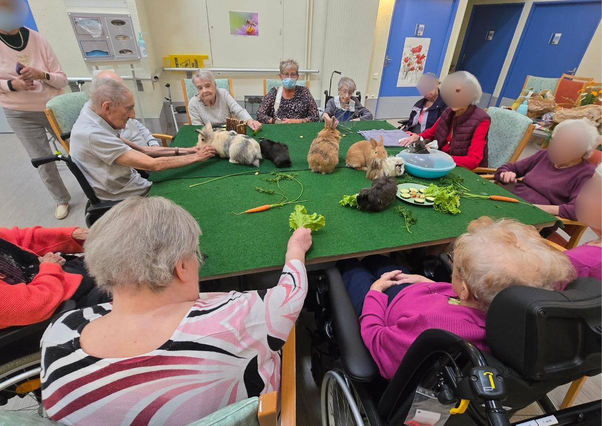 Les résidents sont ravis de retrouver les animaux après une pause de deux mois. Le matin, ils participent à divers jeux de motricité avec le chien et font un parcours. L'après-midi est consacré à la découverte des petits lapins nés fin novembre, offrant des moments de nourrissage et de câlins.